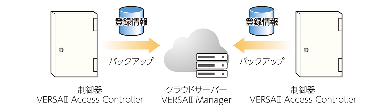 VERSAⅡ Access Controllerの設定データや登録データは常にクラウドサーバー(VERSAⅡ Manager)と同期しており、遠隔所からデータ閲覧や編集を行えます。また、万が一機器が故障した際もバックアップから復旧できます。